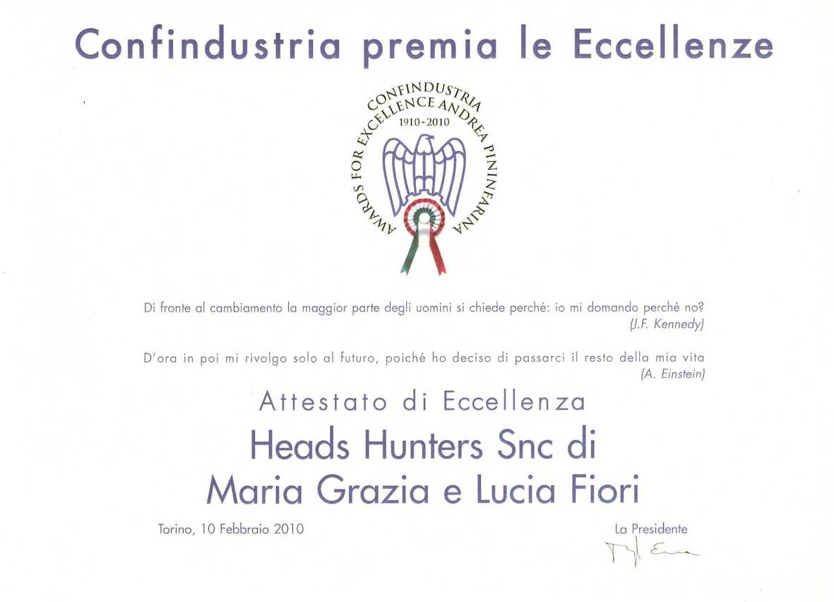 HEADS HUNTERS got the Certification on Excellence at "Confindustria Awards for Excellence Andrea Pininfarina 2010" and the certificate of Best Practices Corporate Social Responsibility 2012, 2013, 2015, 2017 from Lombardy Region, UnionCamereLombardia and Chamber of Commerce of Milan.